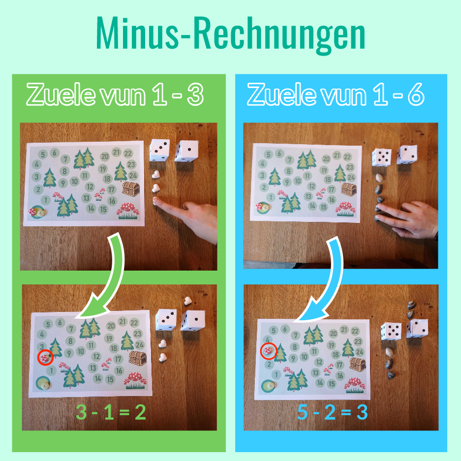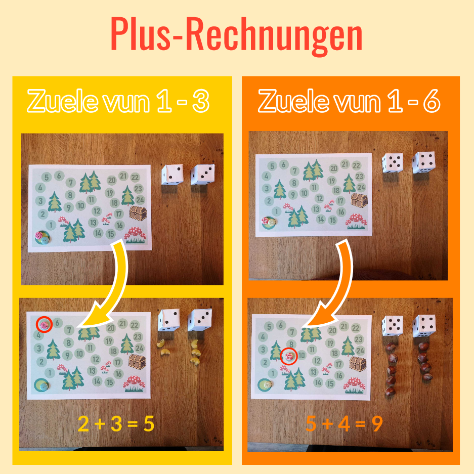 Éischt Schrëtter mat Plus- a Minus-Rechnungen. Entweder mat Zuele vun 1-3 oder méi schwéier mat Zuele vun 1-6. Benotzt fir d´Rechnen am beschte Material fir ofzezielen (Nuddelen, Steng, Kamellen, Knäpp, Nëss…) esou wei ob de Fotoen.